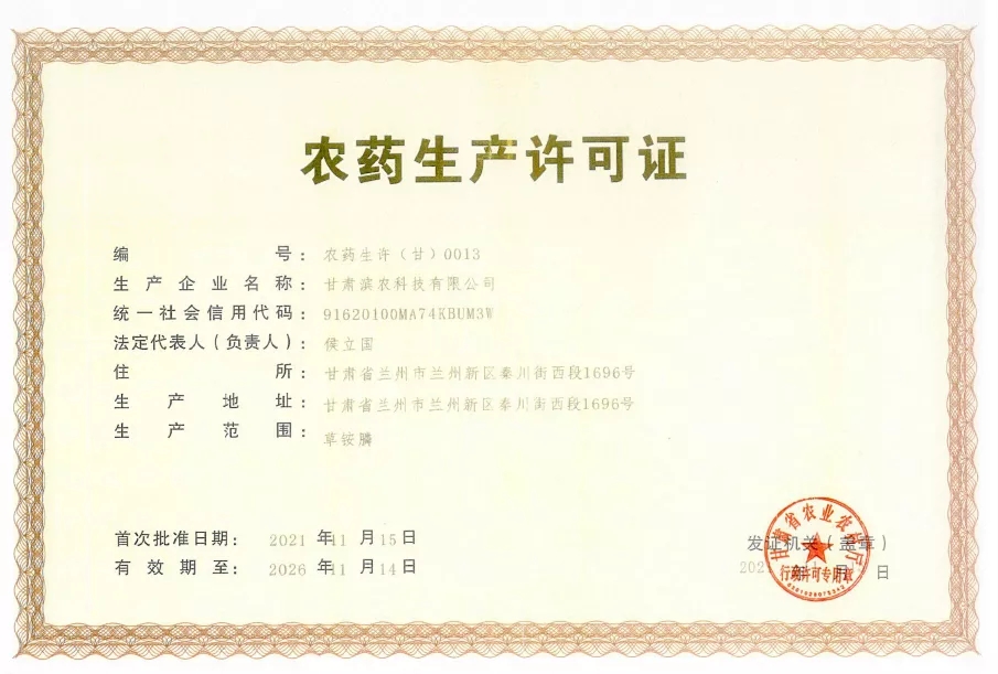 最終,甘肅濱農順利通過草銨膦原藥農藥生產許可審查并取得農藥生產許可證(證號為農藥生許(甘)0013),進一步夯實了公司生產基礎,為濱農戰略發展再添強勁動力。