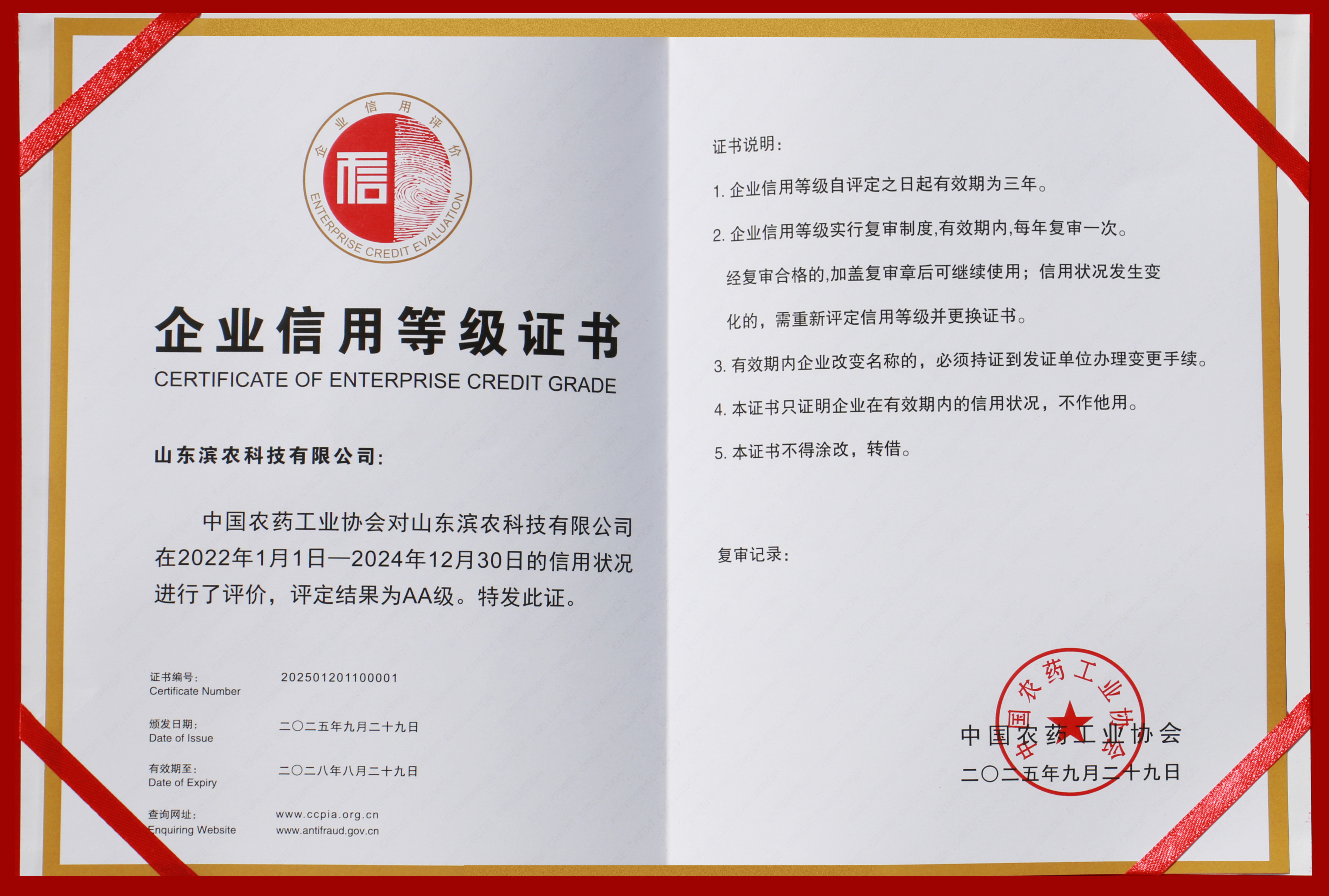 9月29日,中國農(nóng)藥工業(yè)協(xié)會(huì)公布了 2022年1月1日 - 2024年12月30日期間農(nóng)藥企業(yè)信用等級(jí)評(píng)價(jià)結(jié)果,濱農(nóng)科技憑借規(guī)范經(jīng)營、健全信用體系及突出社會(huì)責(zé)任,獲評(píng) AA 級(jí)信用企業(yè),有效期三年,標(biāo)志著我公司信用管理水平與綜合競(jìng)爭(zhēng)力獲國家級(jí)行業(yè)協(xié)會(huì)高度肯定。