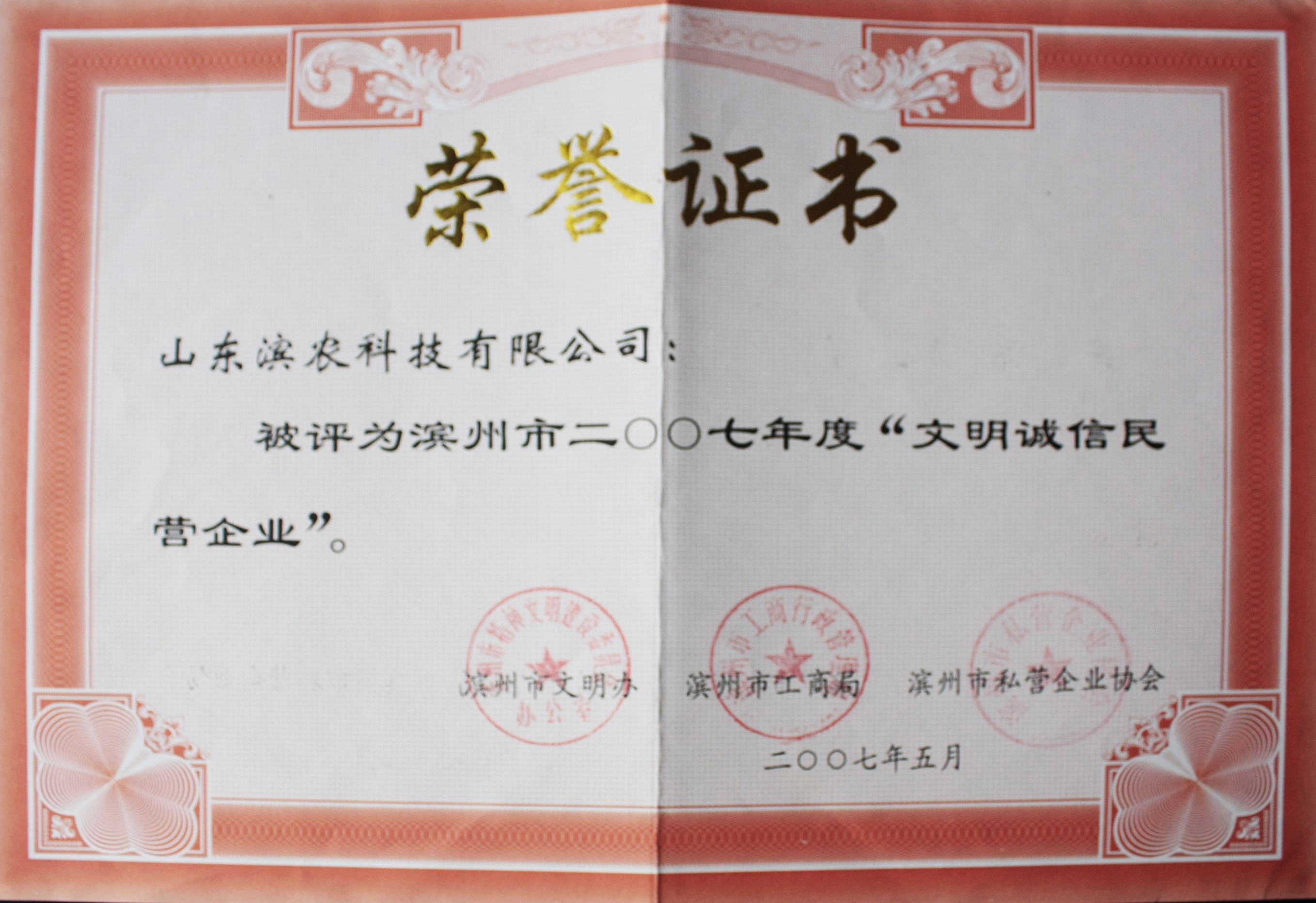 2007年5月,我公司被濱州市工商局和濱州市私營企業協會評為2007年“十佳文明誠信民營企業”。