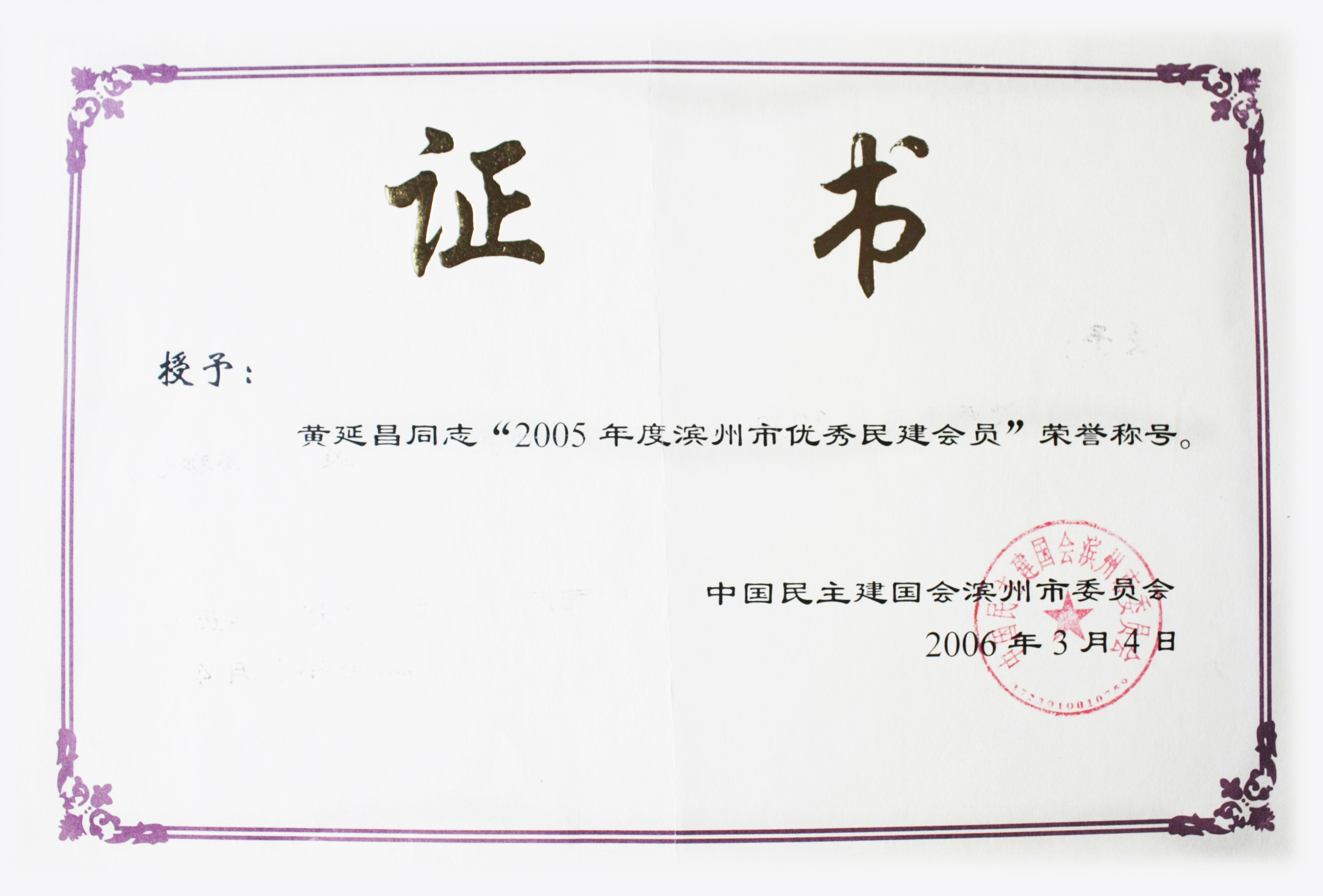 2006年3月4日,我公司董事長黃延昌被中國民主建國會濱州市委員會評為“2005年度濱州市優秀民建會員”。