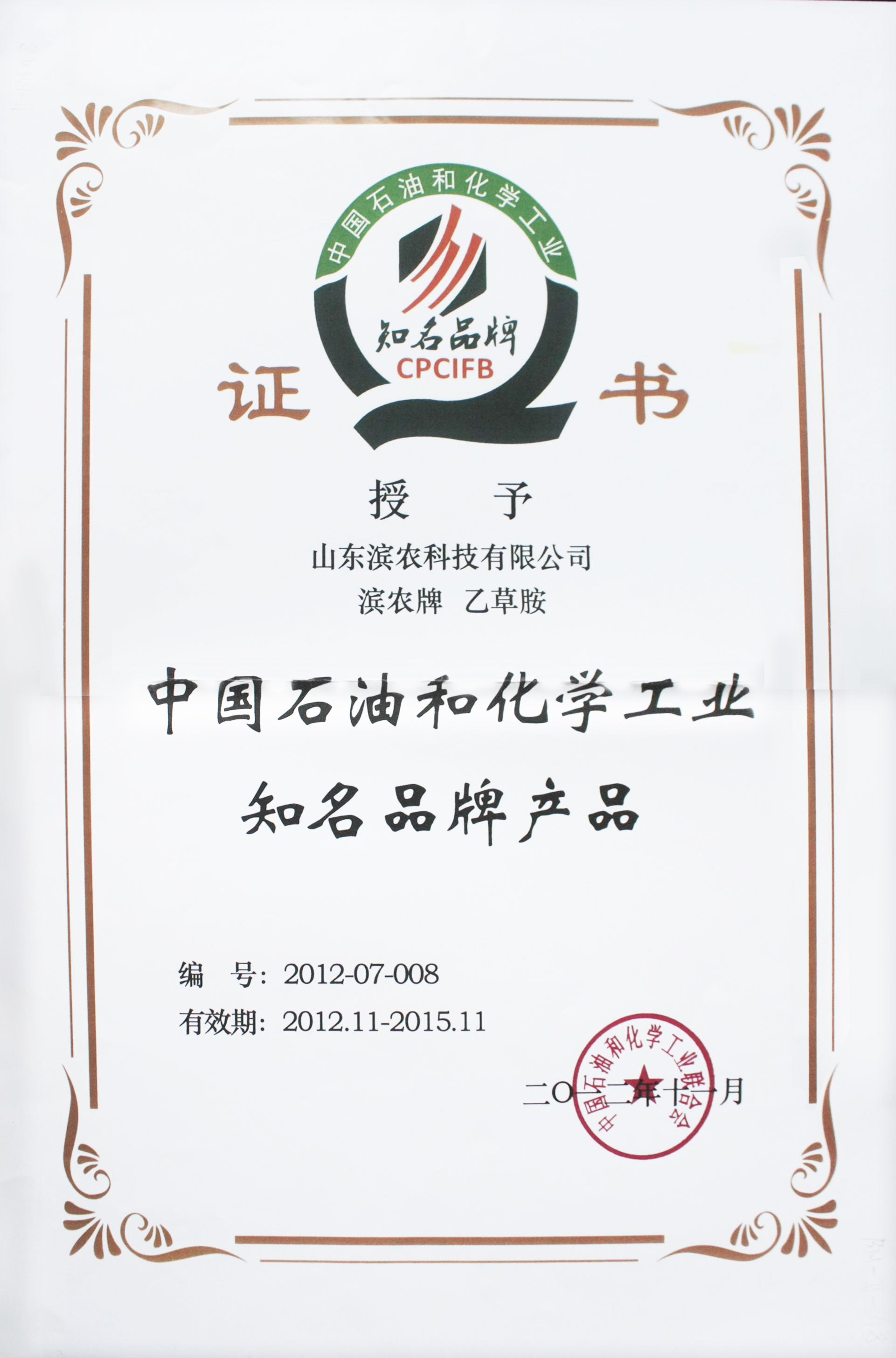 2012年11月,一年一度的“中國石油和化學工業聯合會知名品牌”評選結果揭曉。我公司“濱農”牌乙草胺榮獲“2012 年度中國石油和化學工業聯合會知名品牌”。