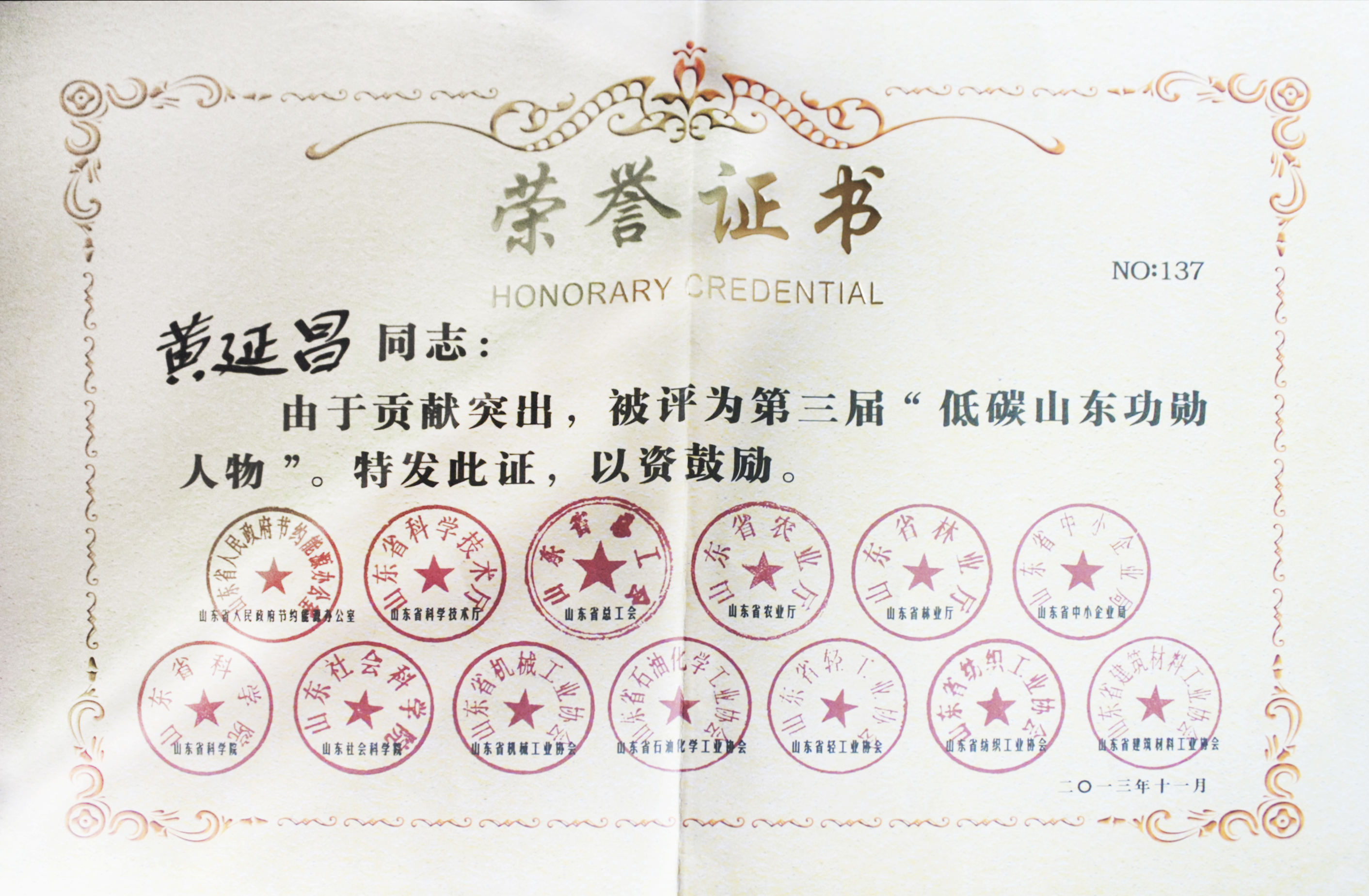 11月27日第三屆(2013年度)低碳山東成果推介暨先進典型表彰大會在山東濟南南郊賓館隆重舉行,大會以“推廣低碳成果、促進綠色發(fā)展、共建美麗山東”為主題,對全省300多項優(yōu)秀低碳成果進行推介,并對我省綠色低碳發(fā)展的先進典型進行了表彰。在經(jīng)過推薦評選、資料申報、資格審查、評委會評審等程序后,我公司董事長黃延昌被評為第三屆“低碳山東功勛人物”。
