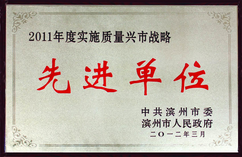2012年3月,我公司獲得濱州市質(zhì)量技術(shù)監(jiān)督局頒發(fā)的2011年度“實施質(zhì)量興市戰(zhàn)略先進單位”榮譽稱號。這是對去年5月份我公司積極參與“市長質(zhì)量獎”申報,并根據(jù)卓越績效體系要求對自身質(zhì)量基礎(chǔ)管理全面規(guī)范改進的肯定與鼓勵。