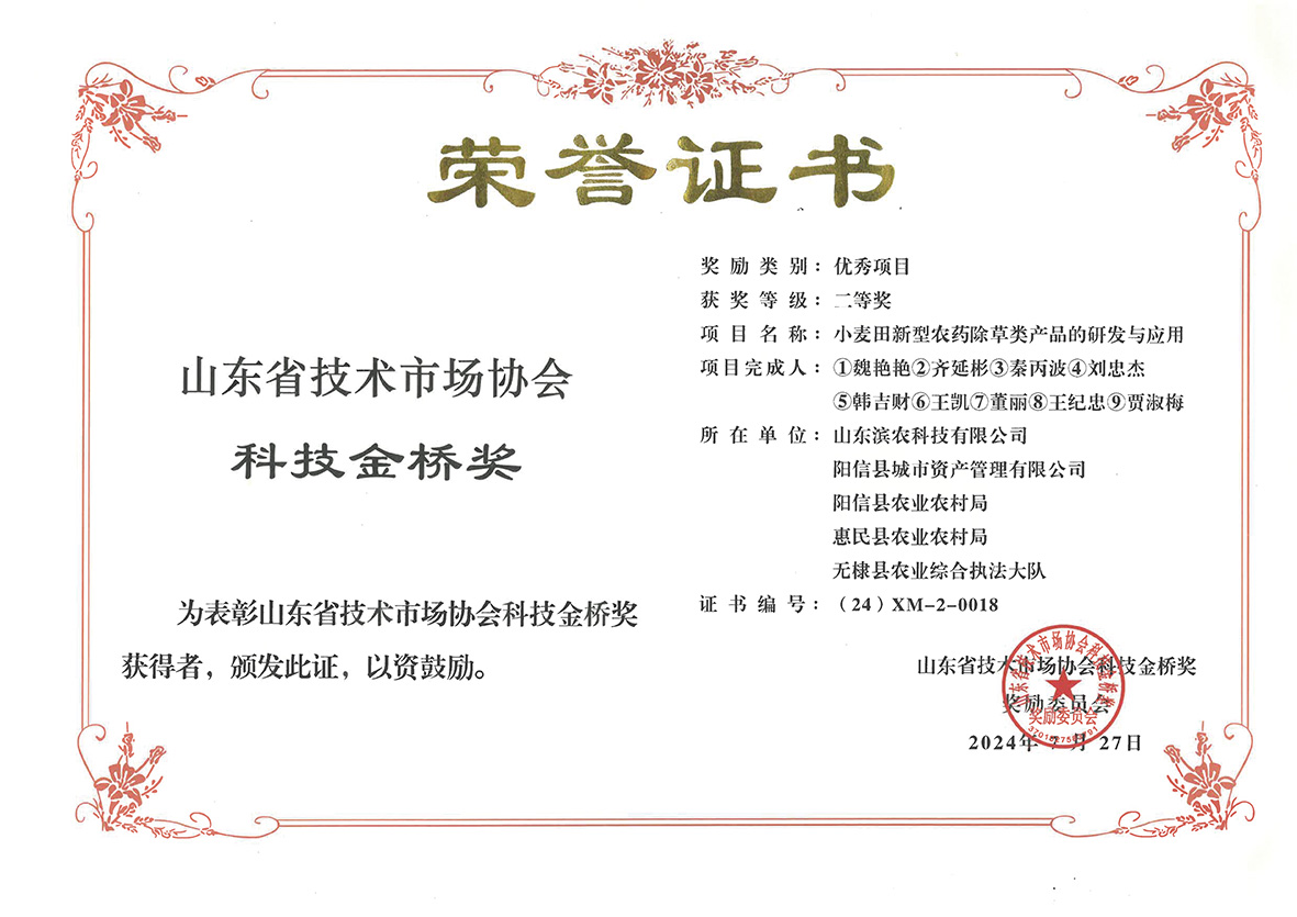 8月30日,2024年度山東省科技金橋獎(jiǎng)表彰獎(jiǎng)勵(lì)大會(huì)暨山東創(chuàng)新驅(qū)動(dòng)發(fā)展高端論壇在山東省干部學(xué)院舉行,各市科技局、省屬高校科研院所分管負(fù)責(zé)人及獲獎(jiǎng)代表150余人參加。山東省技術(shù)市場(chǎng)協(xié)會(huì)副秘書長(zhǎng)、總工辦主任蘇偉宣讀了《關(guān)于2024年度山東省技術(shù)市場(chǎng)協(xié)會(huì)科技金橋獎(jiǎng)獎(jiǎng)勵(lì)的決定》,我公司魏艷艷、劉忠杰、王凱、董麗、賈淑梅等完成的“小麥田新型農(nóng)藥除草類產(chǎn)品的研發(fā)與應(yīng)用”項(xiàng)目,憑借其卓越的創(chuàng)新性和廣泛的應(yīng)用價(jià)值,從眾多參選項(xiàng)目中脫穎而出,榮獲山東省技術(shù)市場(chǎng)協(xié)會(huì)科技金橋獎(jiǎng)優(yōu)秀項(xiàng)目二等獎(jiǎng)。