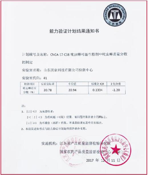 2017 年12 月,濱農科技檢測中心參加了全國22 個省的67 個實驗室參與的由國家認監委(CNCA)組織的能力驗證計劃———吡蟲啉可濕性粉劑中吡蟲啉質量分數的測定。本次質量分數測定為“滿意結果”,順利獲得國家農藥產品質量檢驗中心為下發的結果通知。