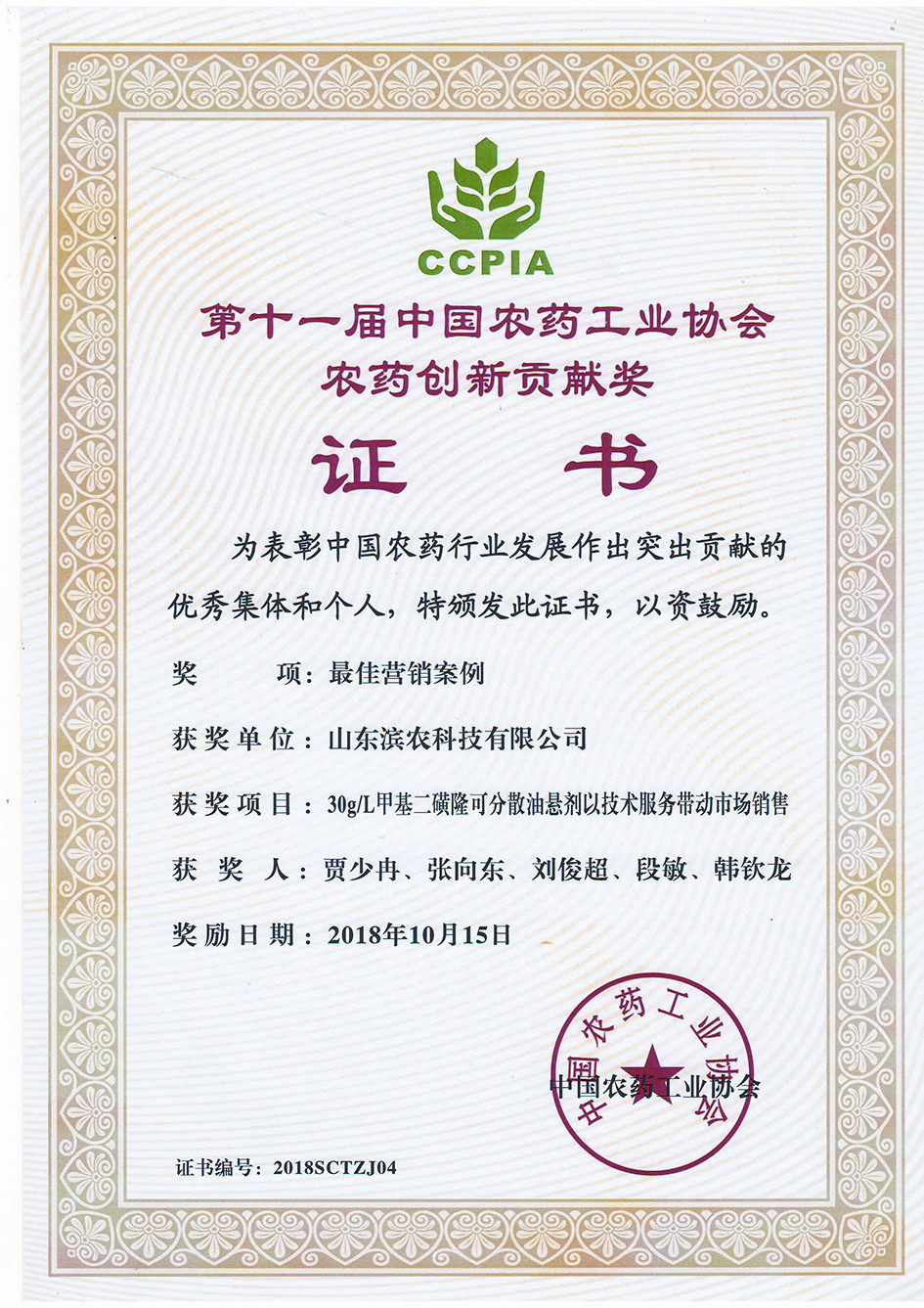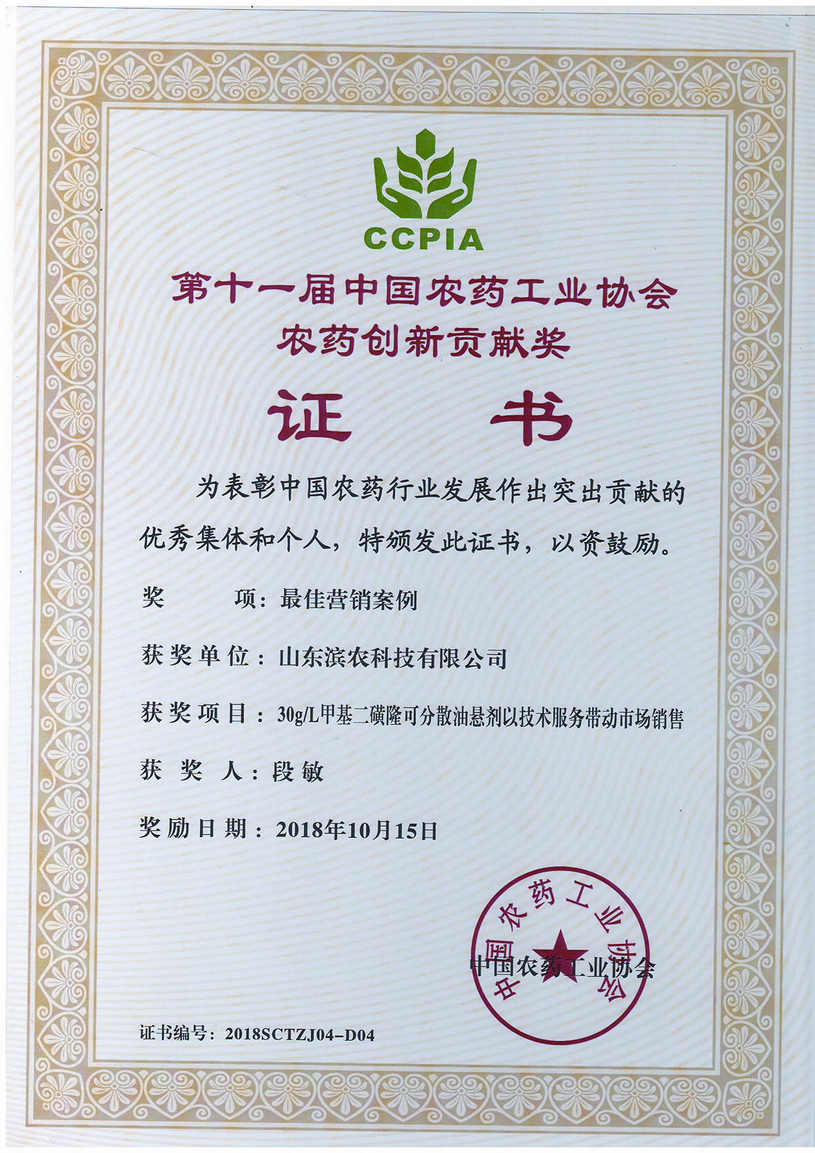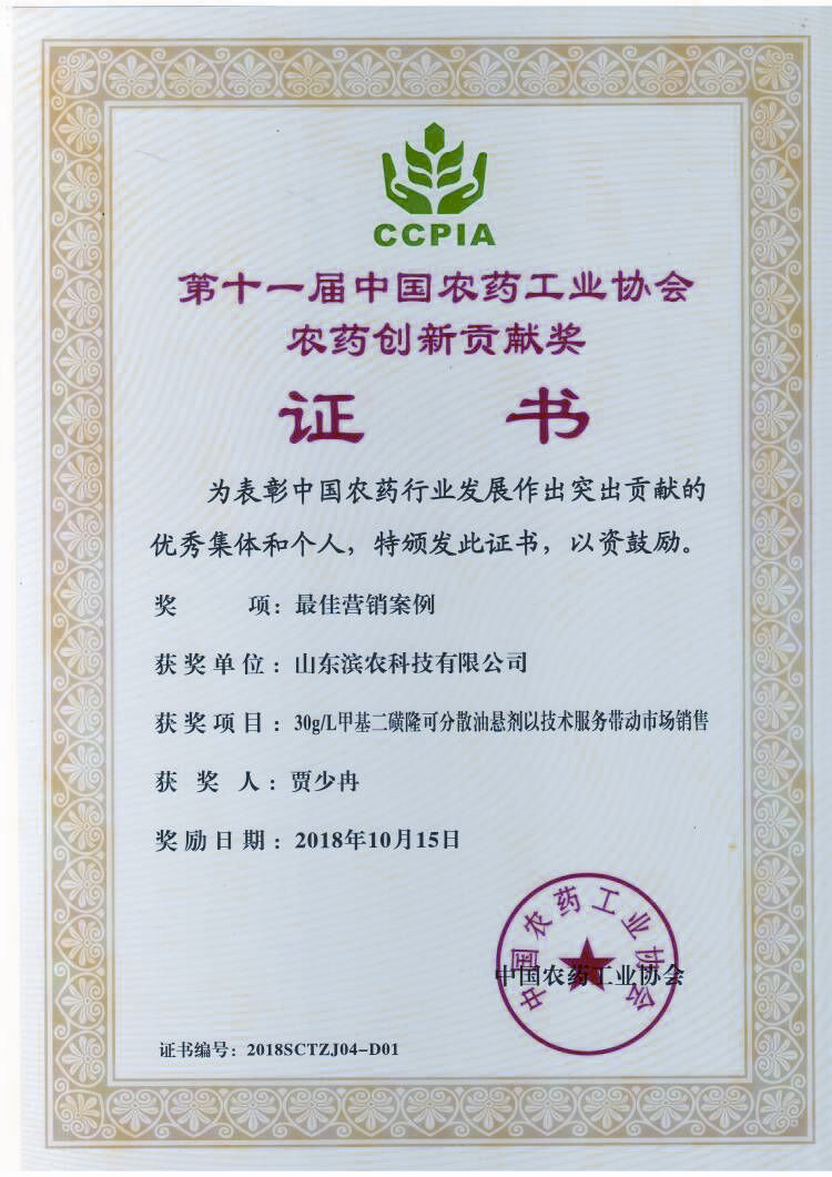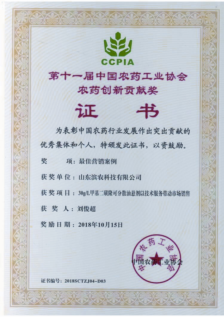 • ■2018-10-15 我公司“30g/L甲基二磺隆可分散油懸劑以技術服務帶動市場銷售”榮獲“中國農