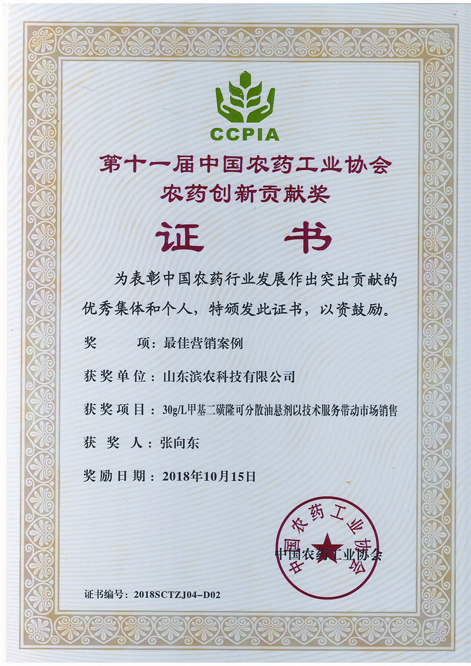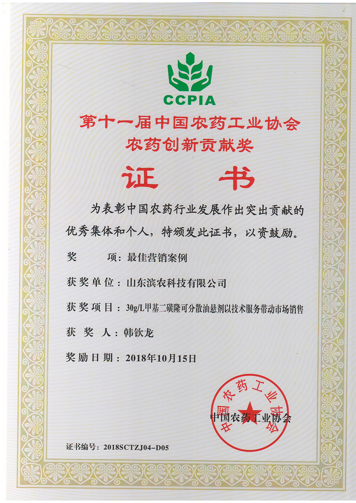 我公司“30g/L甲基二磺隆可分散油懸劑以技術服務帶動市場銷售”榮獲“中國農藥市場拓展獎最佳營銷案例”