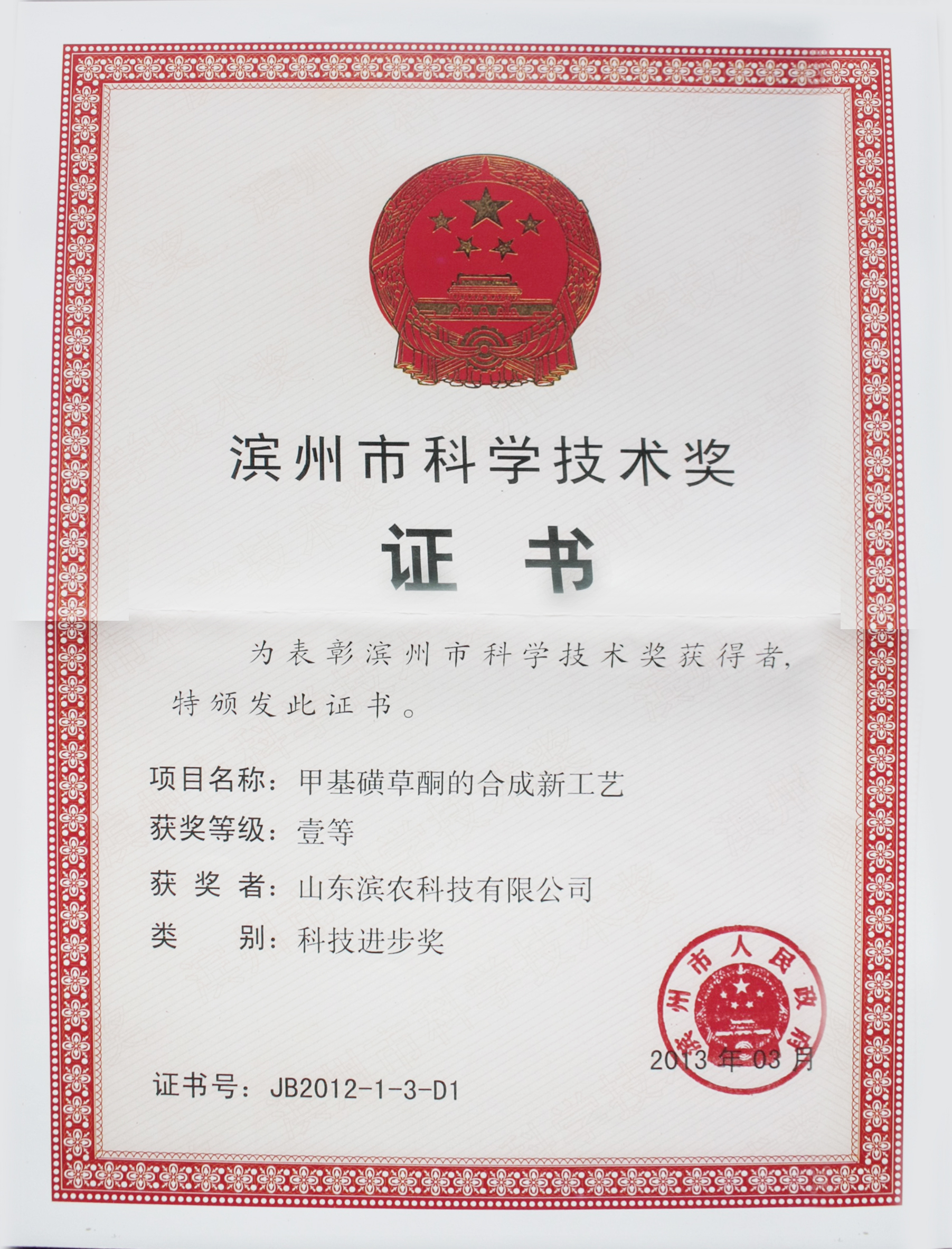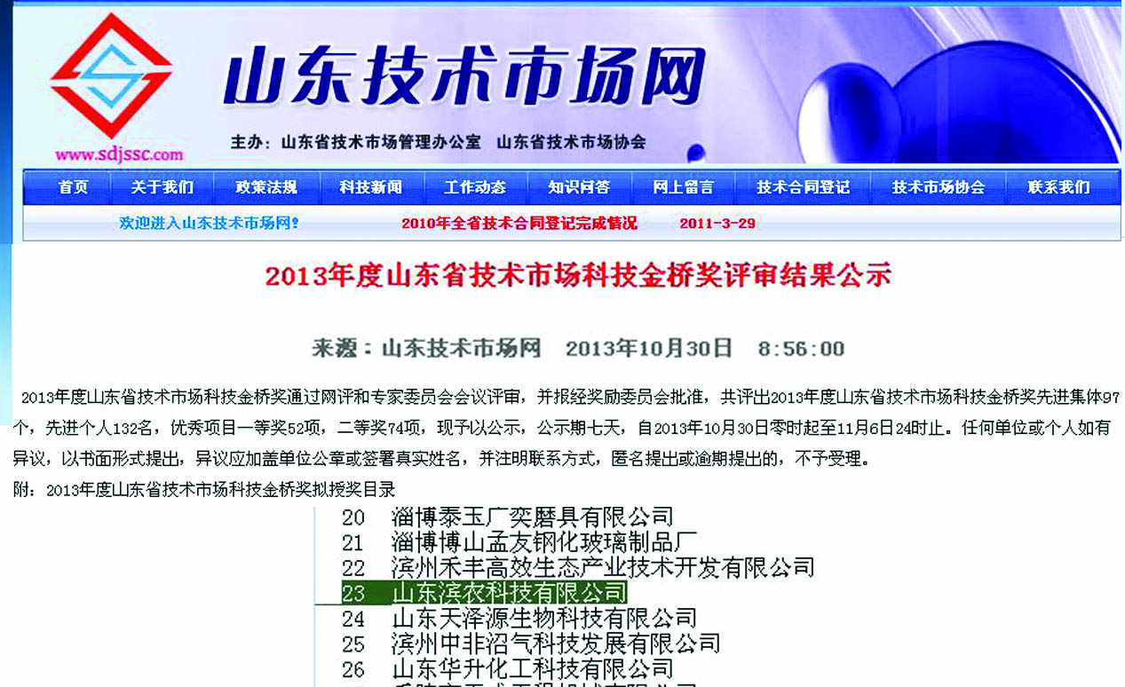 10 月 30 日,山東省科技廳公布了“2013 年度山東省技術市場科技金橋獎”評選結果,濱州市共獲得“山東省技術市場科技金橋獎”21 項,其中,濱農科技被評為“2013 年度山東省技術市場科技金橋獎先進集體”;公司技術總監張玉瑞被評為“2013 年度山東省技術市場科技金橋獎先進個人”;公司項目《甲基磺草酮的合成研究》被評為“2013 年度山東省技術市場科技金橋獎優秀項目二等獎”。