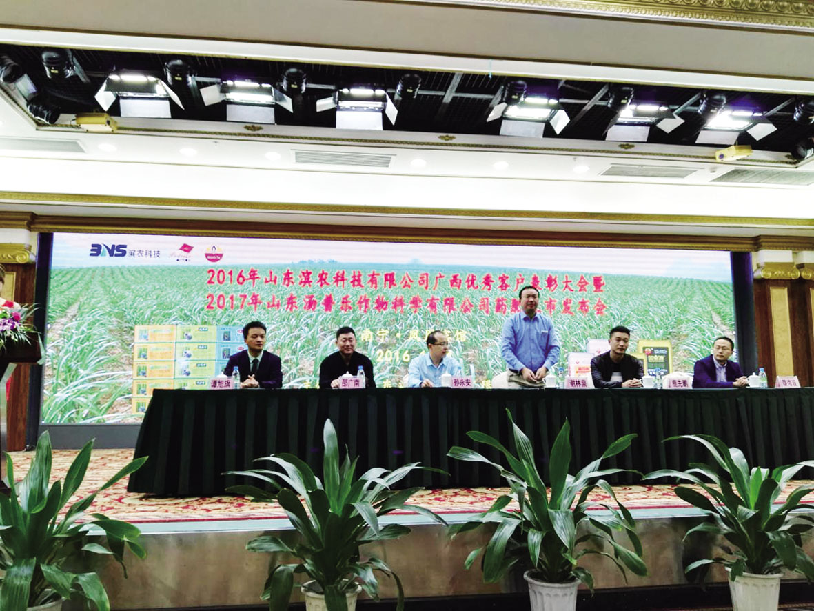 我公司甘蔗田新產品推介會 暨優秀客戶表彰大會在廣西南寧順利召開發布時間:2016-12-31 14:2212月3-5日,由我公司主辦的兩場“甘蔗田新產品推介會暨優秀客戶表彰大會”在廣西南寧順利召開,來自廣西各縣市級代理商和零售商共計500余人參加了會議。 兩場會議分別由南寧普得樂植保有限公司總經理譚旭旗和南寧金子農化有限公司總經理梁祖旺主持。首先,我公司制劑副總助理孫永安介紹了濱農的發展歷史及生產經營情況;隨后,業務經理王超就濱農殺草得、好風度、十里坡、統混凈、濱農蔗好、濱農蔗得鋤、甘蔗樂精品、濱農好時節精品等適用于廣西高糖、高產甘蔗的苗后產品進行了詳細講解;最后我公司銷售六處處長蔡海波針對甘蔗田雜草的發生現狀,雙高甘蔗品種除草劑使用的注意事項進行了講解,并公布了2017年甘蔗田除草劑的產品政策及冬儲優惠政策。 通過這次會議,批發商和零售商充分了解了公司的甘蔗田產品特性和優勢,大大提高了濱農產品在廣西市場的品牌影響力,更堅定了今后合作的信心,客戶紛紛現場交款訂貨,訂貨量遠超預定目標。