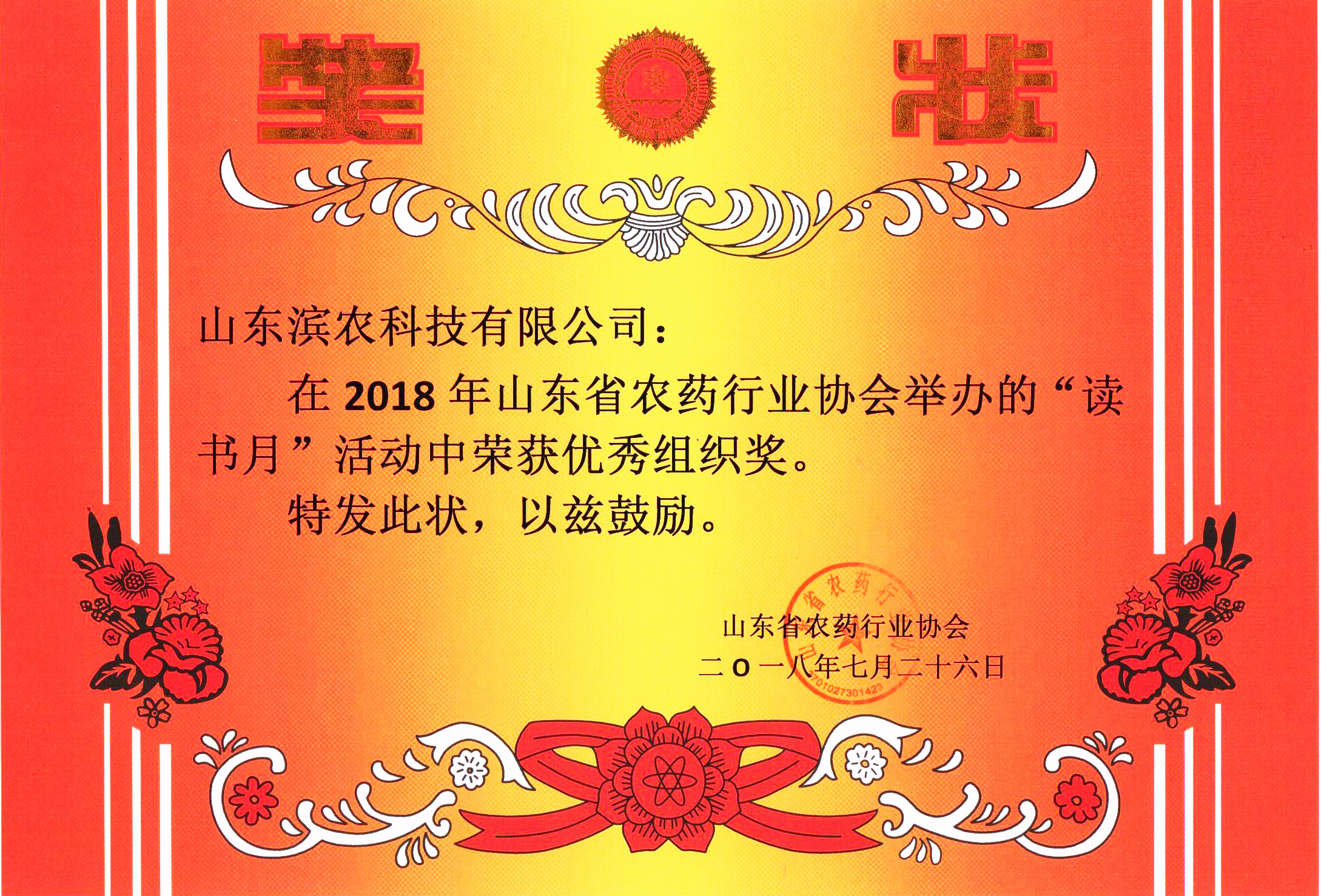 我公司榮獲山東省農藥行業協會 “讀書月”活動優秀組織獎發布時間:2018-09-04 16:25為深入貫徹落實習近平新時代中國特色社會主義思想和黨的十九大精神,推進學習型企業和學習型黨組織建設,進一步豐富職工精神文化生活,5月20日-6月20日,山東省農藥行業協會開展了“讀書月”活動,我公司員工踴躍投稿,最終精選近20篇稿件統一發稿。經評審組綜合評比,我公司榮獲“優秀組織獎”。此次評選中,共有28篇文筆流暢、感情真摯、主題健康向上的原創作品獲獎,其中我公司人力資源部戚哲芬、物流部趙孟孟榮獲一等獎,合成二車間李東、合成七車間張洪河榮獲二等獎,人力資源部楊霖、李明德,稽核部尚靜、后勤部王學民四人榮獲三等獎,行政管理部崔淑強榮獲優秀獎。