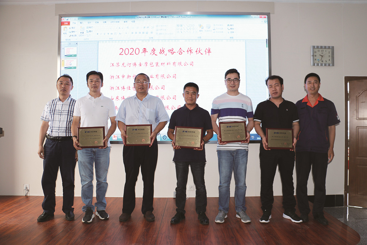 首先,張強結合我公司上一年度的整體生產經營情況,就2020年度生產和市場上反饋的包裝物質量問題與大家進行了交流并就解決方案進行了協商,隨后宣布了今年的優秀供應商名單并現場頒獎合影留念。2020年度戰略合作伙伴為:江蘇龍燈博士摩包裝材料有限公司、浙江申新包裝實業有限公司、浙江博佳包裝有限公司、山東博興大業包裝有限公司、濟南新先鋒至尊包裝有限公司;2020年度優秀供應商為:濱州魯達包裝有限公司、山東睿豐包裝有限公司、山東葉華包裝有限公司、格瑞夫包裝有限公司、臨淄振芳包裝有限公司。