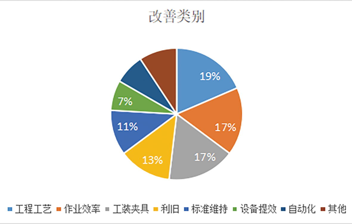 為進一步激勵公司各系統(tǒng)的改善熱情,發(fā)揚持續(xù)改善的精神,同時也為了將各部門的精益改善事項實現(xiàn)組織內(nèi)分享與進一步評價,精益改善辦于10月16日分別組織了以小組為單位的線上發(fā)表會,共有36個部門參與了發(fā)表。本月共提報255項改善,發(fā)表部門參與率6.8條/部門。改善類別占比較大的有工程工藝改善、作業(yè)效率改善、工裝夾具改善、利舊改善以及設(shè)備提效改善等。