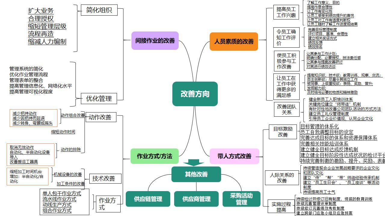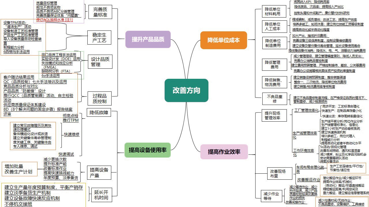 精益改善辦根據車間日常改善中遇到的問題,將改善方向匯總成思維導圖形式供大家參閱,改善方向重點從8個方面做了詳細闡述。針對設備管理方面如何進行改善,精益改善辦從公司精益管理微信群向大家定期發布《卓越班組TPM》知識,管理者可根據自己部門實際情況和班組長展開學習,從降低故障率、提高設備產量、延長開機時間等方面,與安全管理相結合,緊密溝通設備管理部門的日常管理工作,將設備管理工作落地實施并有效運行。