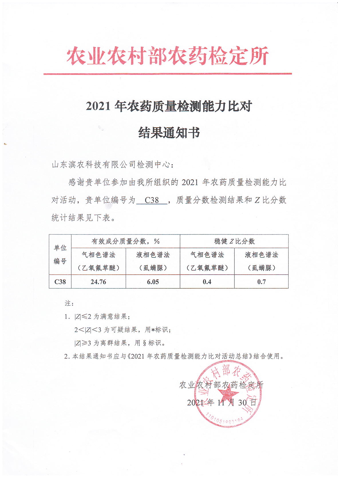 我公司取得2021年農藥質量檢測能力比對活動優異成績發布時間:2022-01-07 16:45為進一步加強實驗室管理,提高農藥產品質量檢測能力,今年5月,農業農村部農藥檢定所組織開展了2021年農藥質量檢測能力比對活動,126家具有農藥質量檢測能力的科研、生產、試驗、檢驗檢測等單位參加,11月30日,接比對活動結果通知,我公司順利通過2021年農藥質量檢測能力比對考核。此次檢測活動隨機分為A、B、C共3組,數據處理采用穩健統計方法,分別對氣相色譜法乙氧氟草醚和液相色譜法虱螨脲質量分數檢測結果進行統計學處理。我公司實驗室編號為C38,穩健Z比分數乙氧氟草醚為0.4,虱螨脲為0.7,與參加活動的其他單位比較,處于本次比對中的上游水平。此次能力比對活動有力檢閱并推進了我公司檢測技術能力得提升。 ![]() |