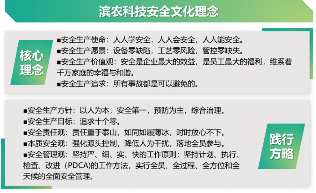 《安全文化手冊》由集團培訓及企業文化部主導編寫,共分“5篇、21節、2談、1倡議”,從領導作用到理念系統、制度保障、員工行為、環境建設,全面梳理構建起了1.0版的濱農科技安全文化體系,為公司實現“全員、全過程、全方位、全天候”的全面安全管理奠定文化基石,為激發全員參與的信念和行動樹起文化旗幟,明確公司零事故的管理追求,梳理實現零事故的管理方法。