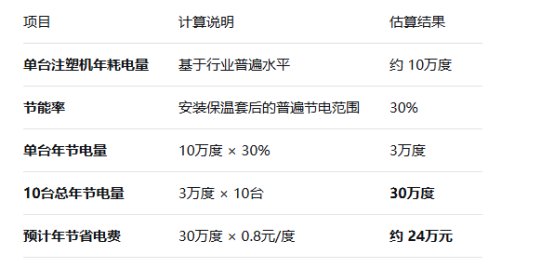 基礎(chǔ)數(shù)據(jù):一臺中型注塑機(jī)(假設(shè)功率為15kW)的年耗電量巨大。其加熱圈部分(即保溫套主要節(jié)能對象)的耗能約占整機(jī)能耗的30%-40%。