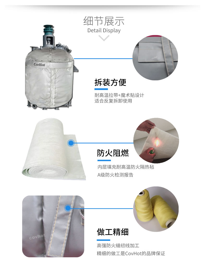 工業(yè)罐體保溫套無需專業(yè)保溫人員,無需專業(yè)培訓,操作簡單快速,表層纖維布不含石棉成分,防油、防水性能優(yōu)良,無纖維飛散問題,環(huán)保、安全、衛(wèi)生。隔熱保溫效果佳,耐溫可達1170度。具有易操作,節(jié)省維護時間和保溫成本。光澤、平整、美觀、使用壽命長、防雨、防酸堿、抗老化,柔軟,拆卸方便,重復使用,節(jié)能環(huán)保。解決了經(jīng)常拆卸部位難以重新保溫的問題,減少了能源浪費。