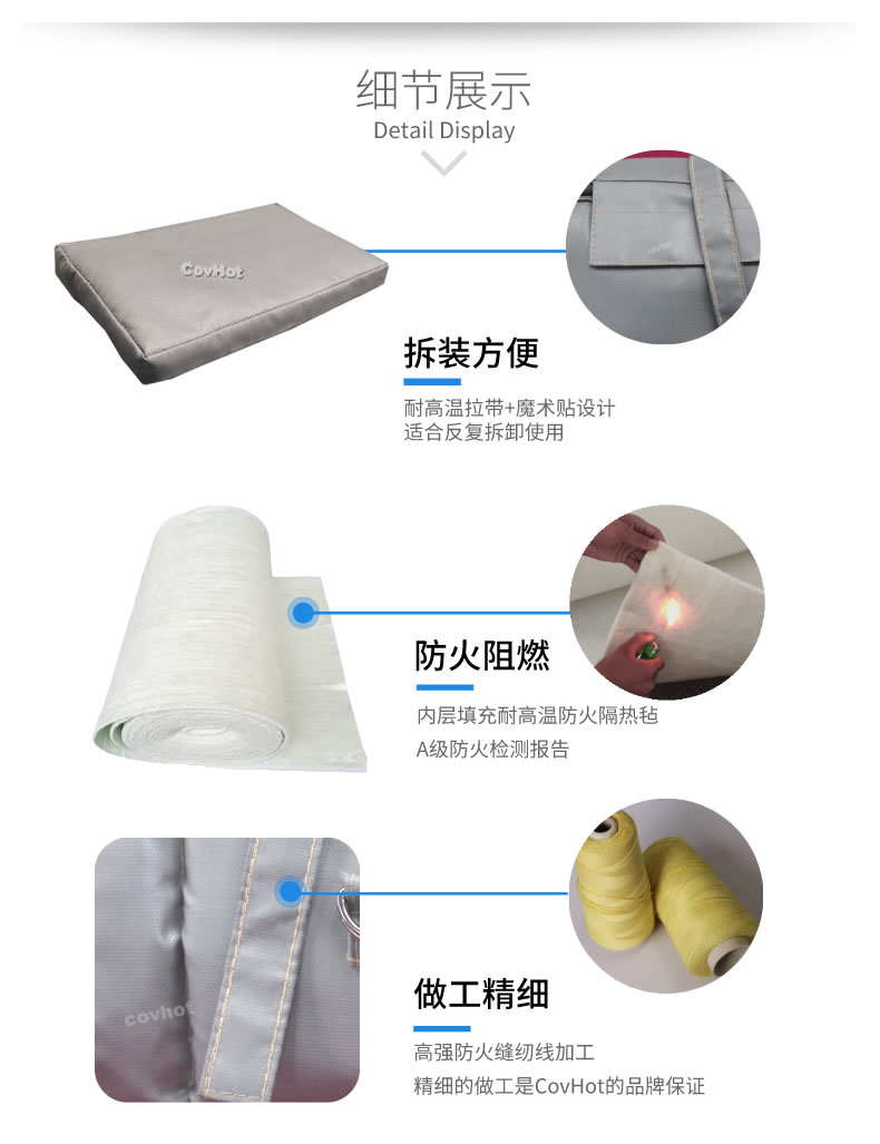 可拆式保溫套保溫效果好,拆裝方便,易于日常維護(hù)保養(yǎng),能反復(fù)使用,對環(huán)境無污染,與人體接觸后不刺激皮膚。根據(jù)現(xiàn)場的物料產(chǎn)生火災(zāi)的可能性、火災(zāi)的預(yù)期溫度、救火需要的時(shí)間等綜合考慮,設(shè)計(jì)適應(yīng)不同的溫度、耐火時(shí)間,從而達(dá)到經(jīng)濟(jì)、合適的防火效果。